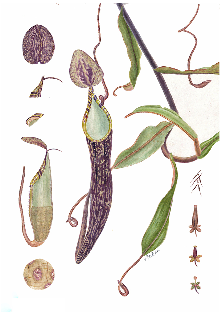 Behind every botanical painting lies a story and adventure, just like this painting of Nepenthes spectabilis Danser. This is the first Nepenthes I painted from a specimen I collected directly from its habitat on Mount Sibuatan, Dairi Regency, North Sumatra.