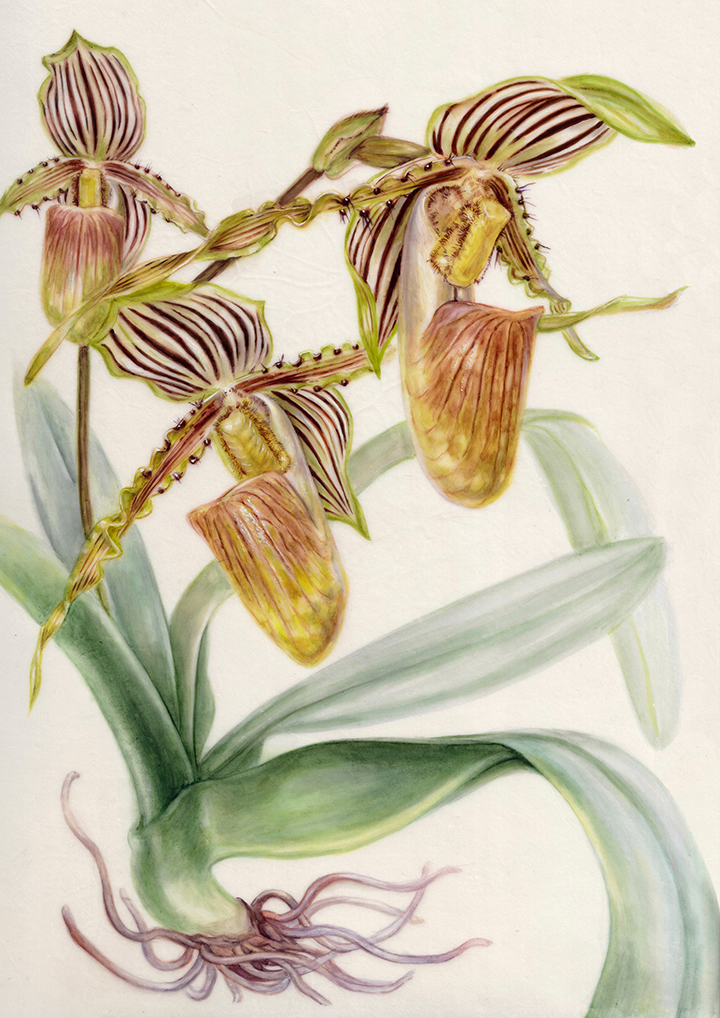 I painted Paphiopedilum ‘Prestan’ on classic calfskin vellum. This type of vellum isn’t as smooth as Kelmscott, so it feels easier to work with. It’s thinner than Kelmscott vellum and still retains a texture resembling thin skin veins, with a more cream/off-white colour. I also painted Paphiopedilum ‘Prestan’ directly from a living specimen, observing every detail and enjoying the process of painting it.