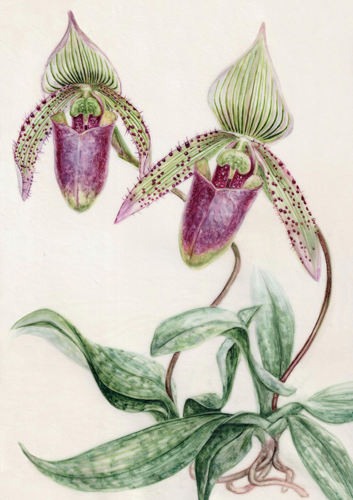 Paphiopedilum superbiens (Rchb.f.) Stein. from Sumatra. Observing and painting from a live specimen I obtained allowed me to study every detail. I painted it on Kelmscott vellum. This was my first experience painting on vellum. Kelmscott vellum is one of the vellum types used in botanical painting. It has a smooth and fine texture with a white colour. Painting on smooth vellum that is easily lifted with dry brush technique requires extra patience.