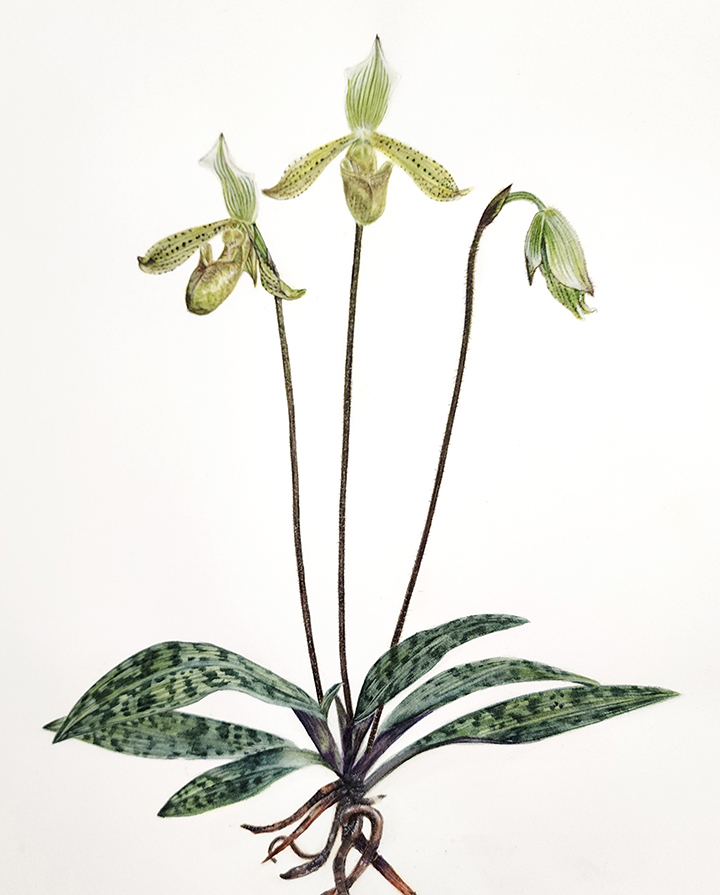 From observing the subject, documenting, finding references, determining a good composition, and choosing the medium, I faced many obstacles and challenges, especially for workers like me who always feel short of time for research and other things. I included this artwork even though it wasn’t selected because it wasn’t fully finished, just to get feedback from the jury about the artwork. In the end, with all the limitations, when I could feel peace while working and admiring the beauty of the slipper orchid, P. tonsum was completed.