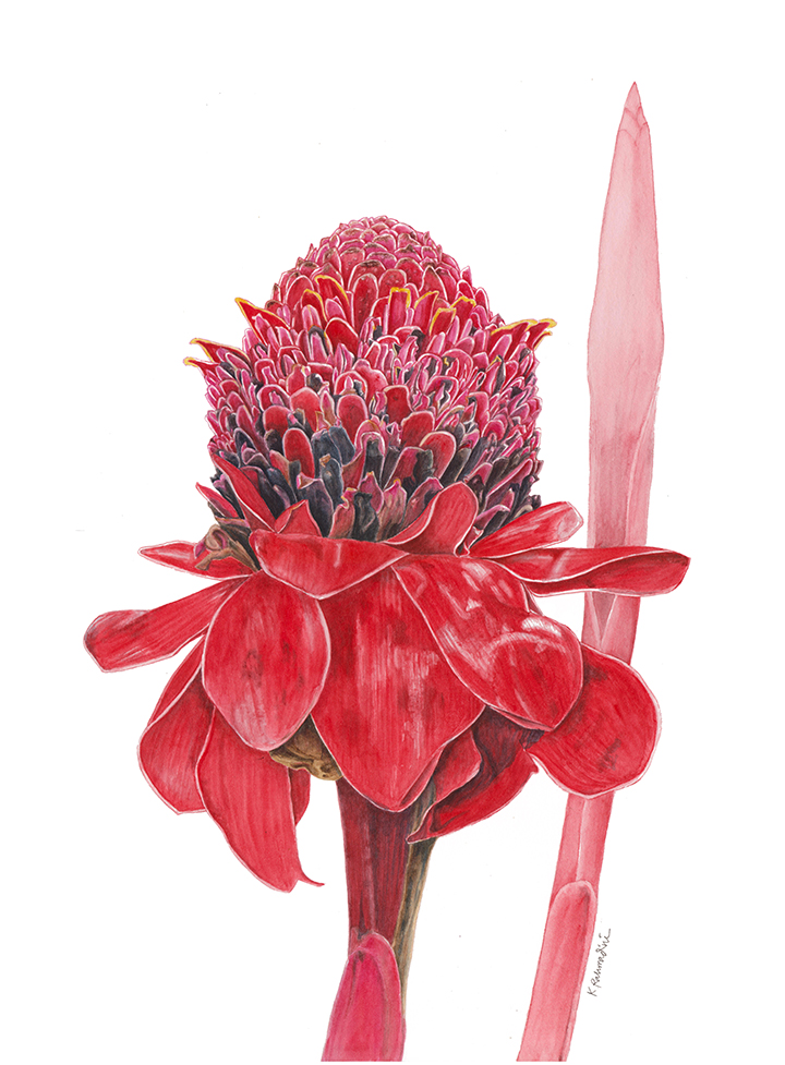 This is the second painting in the ‘Torch Ginger series’ by the artist. This time, the subject is the red torch ginger (Etlingera elatior), sourced from the plant collection at the Bogor Botanical Gardens. Created with the artist’s favorite medium of watercolour on paper, the painting exhibits bright and translucent colours typical of the medium.