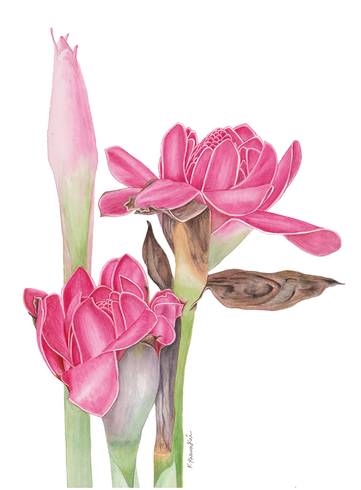 This painting marks the debut of the torch ginger series by the artist. In “Pink Torch Ginger,” the artist endeavors to capture the enchanting allure of the torch ginger (Etlingera elatior) blossoms, tinged with a pinkish hue, sourced from the plant collection at the Bogor Botanical Gardens. Employing watercolour on paper, the artist seeks to convey the exquisite beauty of these flowers.