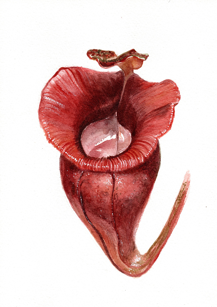 A single plant object of a red pitcher plant serves as a study of form and watercolour material. Watercolour is a relatively challenging material to apply. With this medium, one must control the water and paint intensity to adjust the colour value to achieve the desired quality. In this study, the eyes are trained to observe accurately, while the hands are trained to realize shapes, light, and shadows [1]. The most influential aspect of drawing study is frequent practice to train the motor skills and coordination between the eyes, hands, and sense. Eventually, individuals discover the best approach for them. Supported by theories on material usage and form creation, although ultimately each individual finds the best method in their practice. This plant was chosen because it exhibits sufficient characteristics for study, from its shape, colour, detail, to the visual volume. It is presented as a single object to focus on visual study maximally. Besides form study, material study is also conducted to understand the characteristics of this watercolour medium.