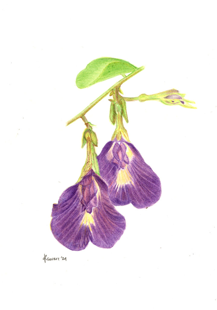 I chose to draw this plant not only because of its many health benefits but also because of its beautiful colours, ranging from blue-purple to whitish-purple. The flower’s petals are funnel-shaped with a butterfly-like crown and produce pod-like fruits that are approximately 7 to 14 cm long. This plant is a climbing vine.