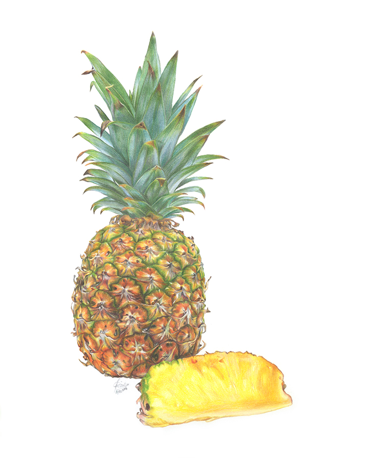 Presenting the refreshing essence of pineapples which is so familiar in Indonesia, through coloured pencil strokes on paper.